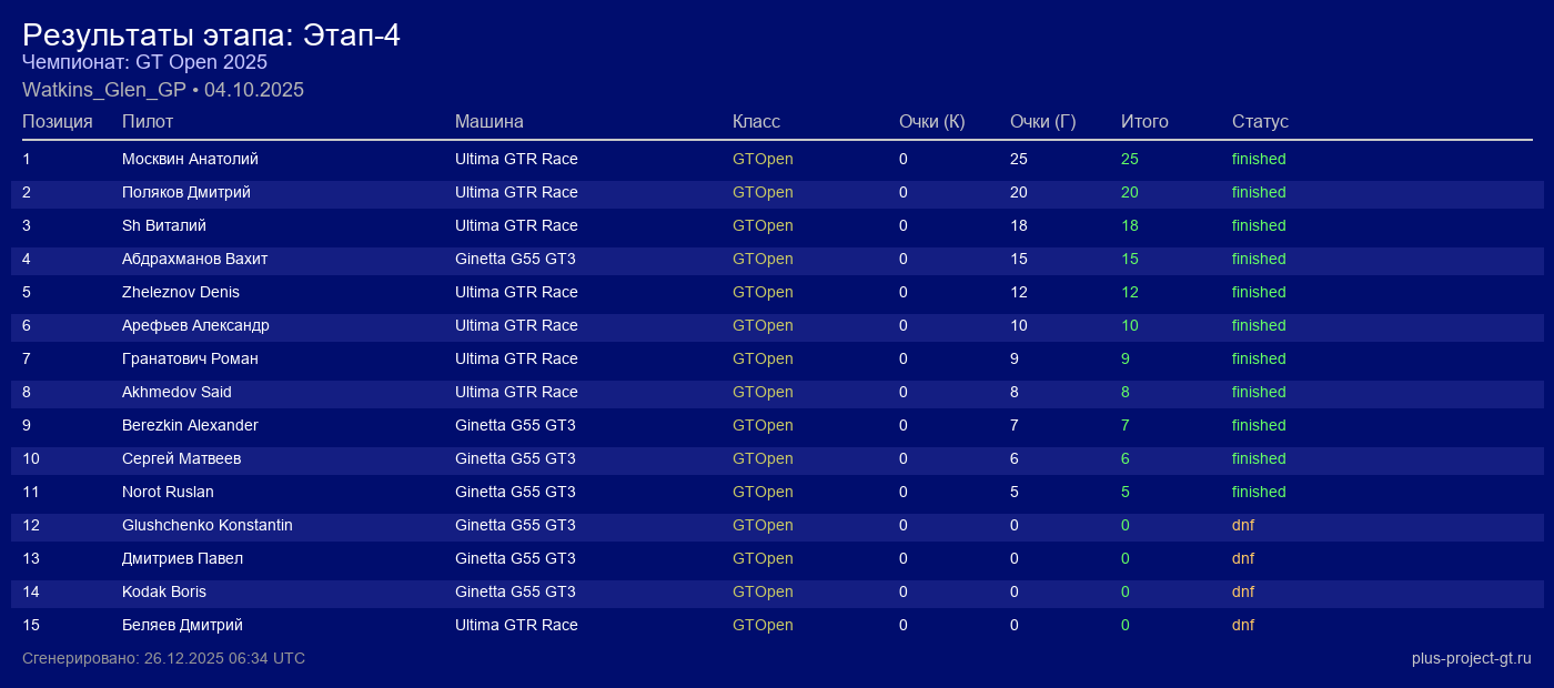 Ultima GTR Race | WSI Thunder Garage | 20 | 43 | 1:45.155 | 76:30.630 | Финиш |
