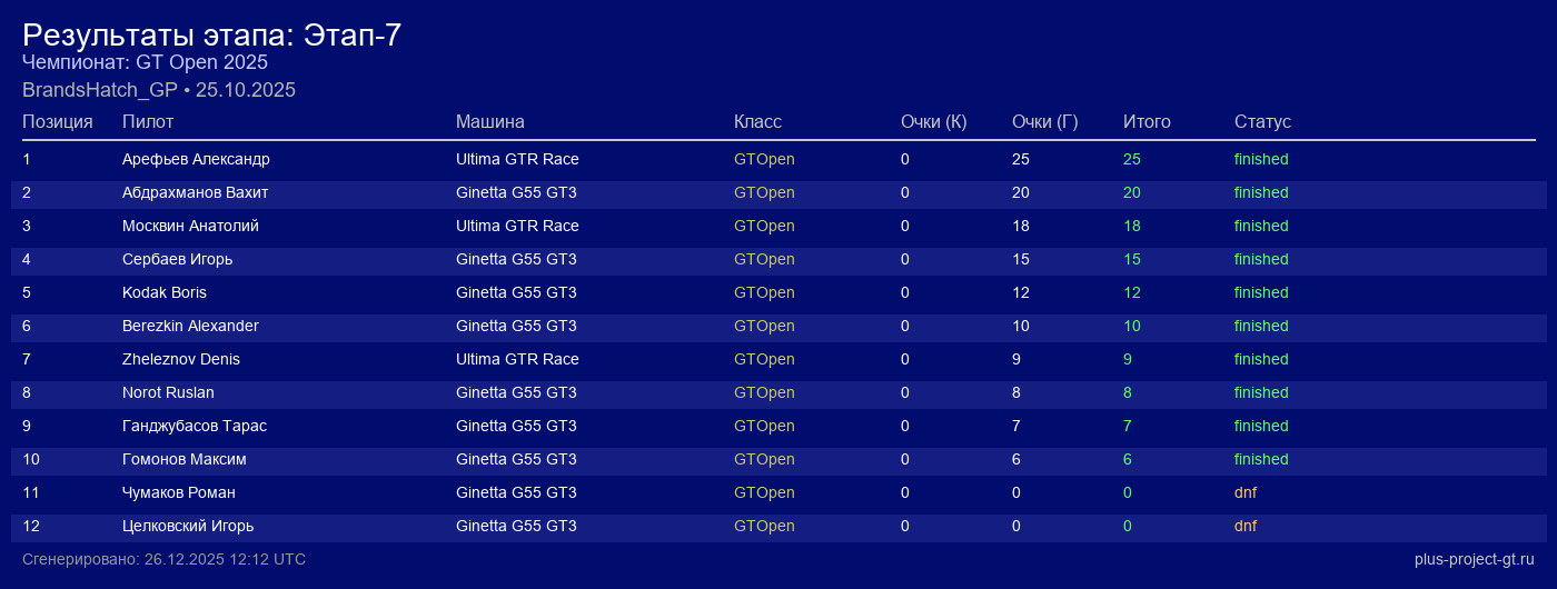 Ultima GTR Race | 25 | 52 | 1:26.099 | 76:13.680 | Финиш | |