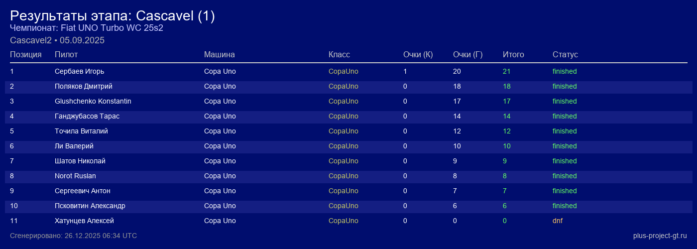 Copa Uno | 17 | 15 | 1:20.497 | 20:34.740 | Финиш | |