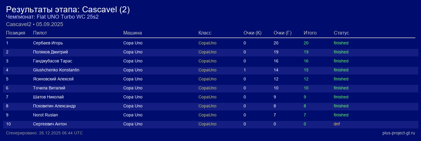 Copa Uno | 15 | 15 | 1:20.783 | 20:44.280 | Финиш | |