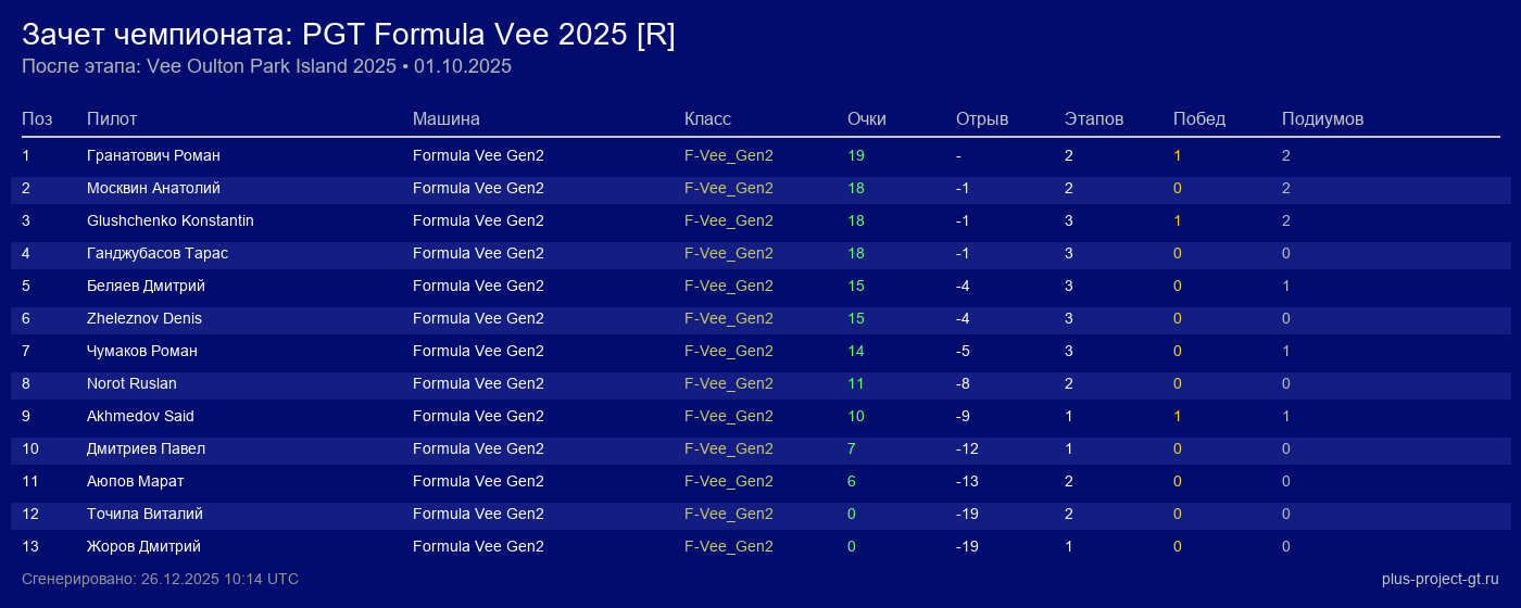 Formula Vee Gen2 | 6 | 15 | 1:45.779 | 27:01.440 | Финиш | |