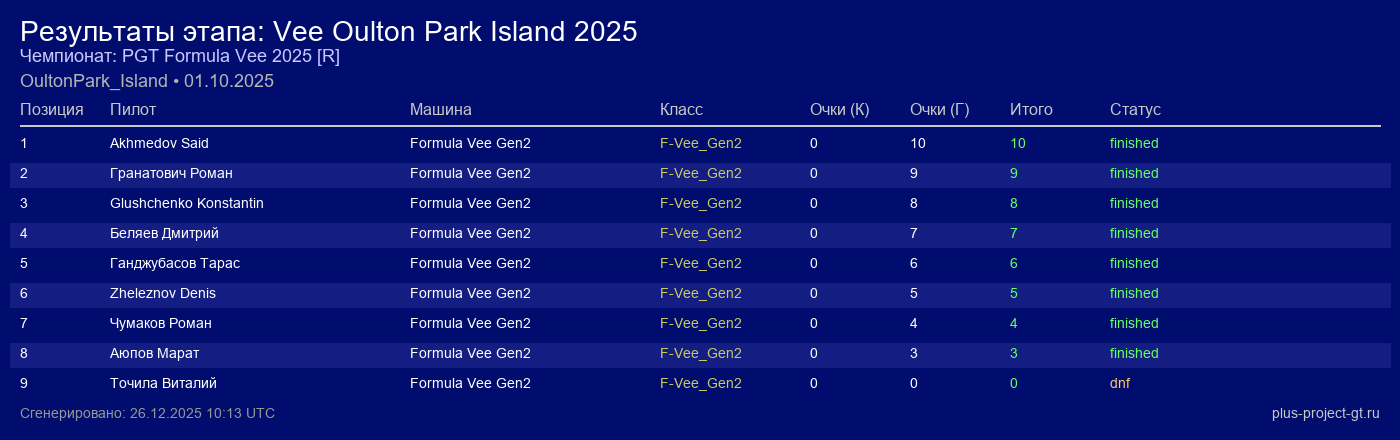 Formula Vee Gen2 | 9 | 15 | 1:43.870 | 26:30.380 | Финиш | |