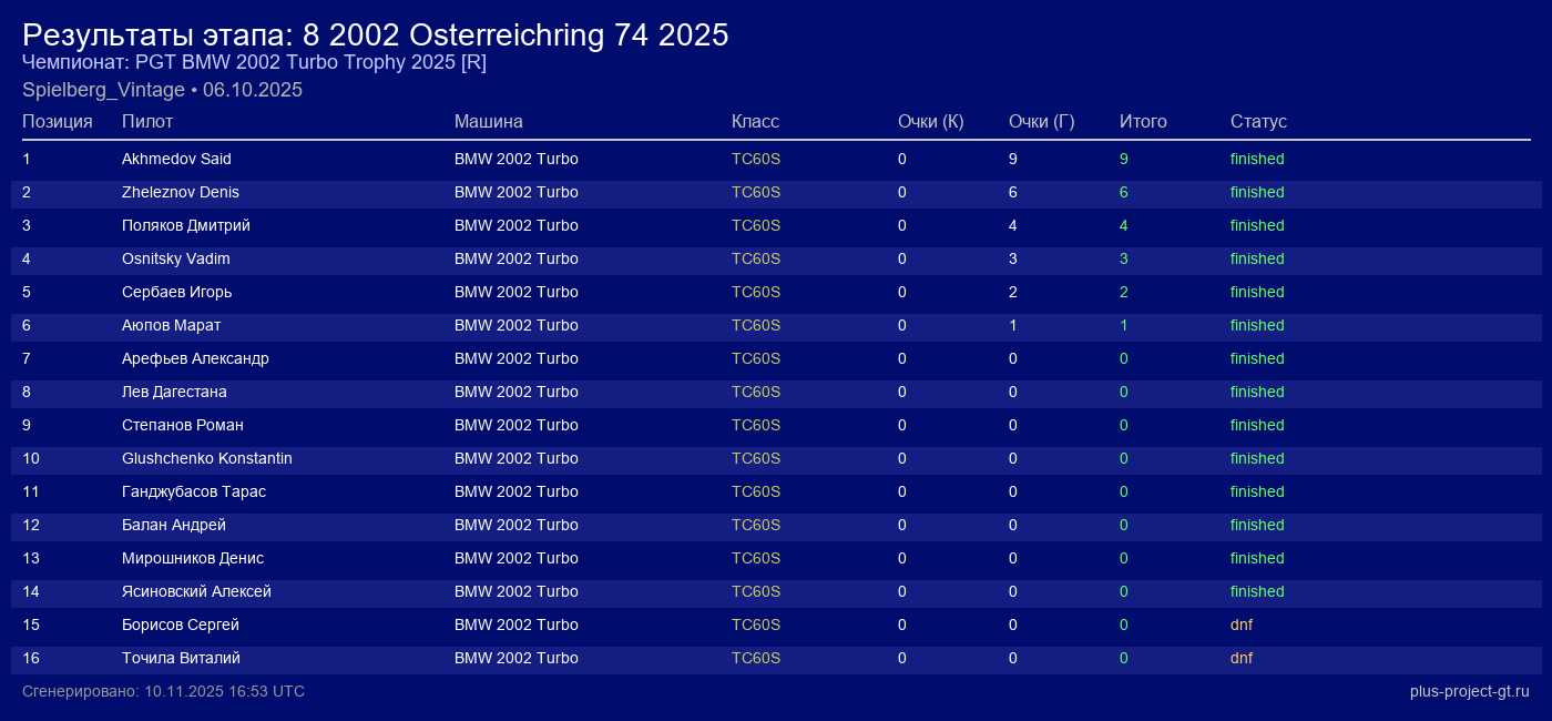 BMW 2002 Turbo | 0 | 9 | 2:20.436 | 24:02.690 | Финиш | |