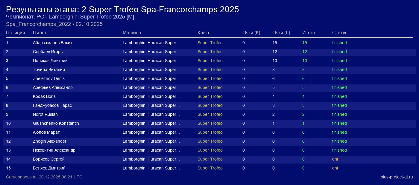 Lamborghini Huracan Super Trofeo EVO2 | 15 | 20 | 2:17.002 | 46:15.100 | Финиш | |