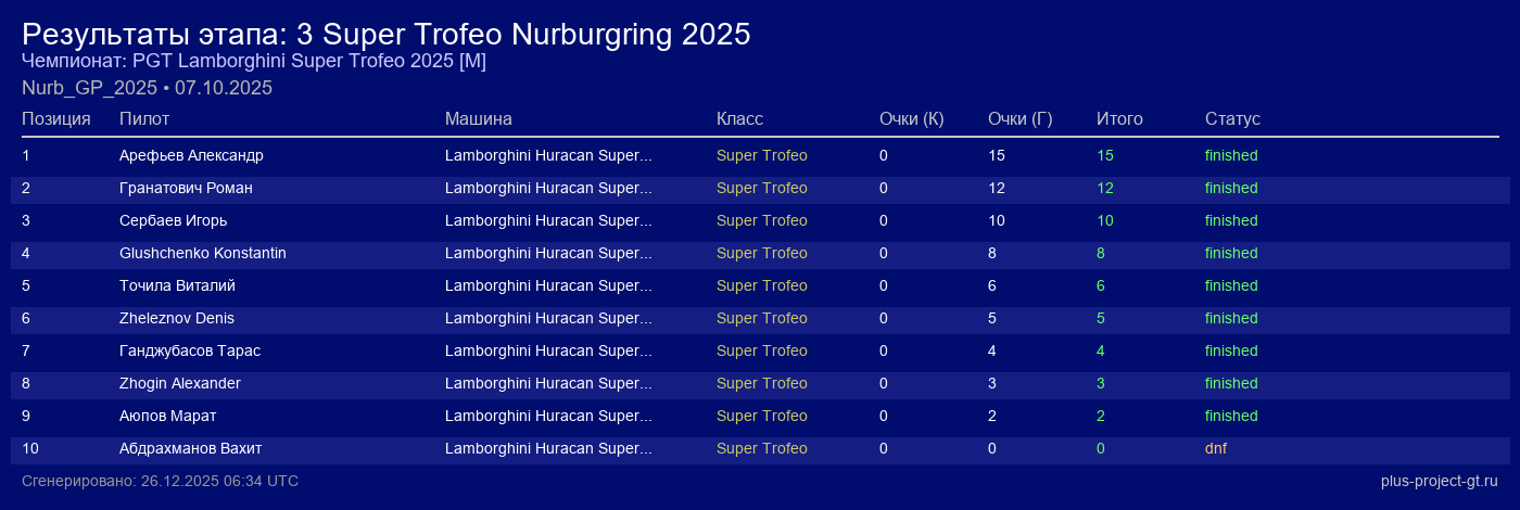 Lamborghini Huracan Super Trofeo EVO2 | 10 | 21 | 2:13.160 | 47:10.910 | Финиш | |