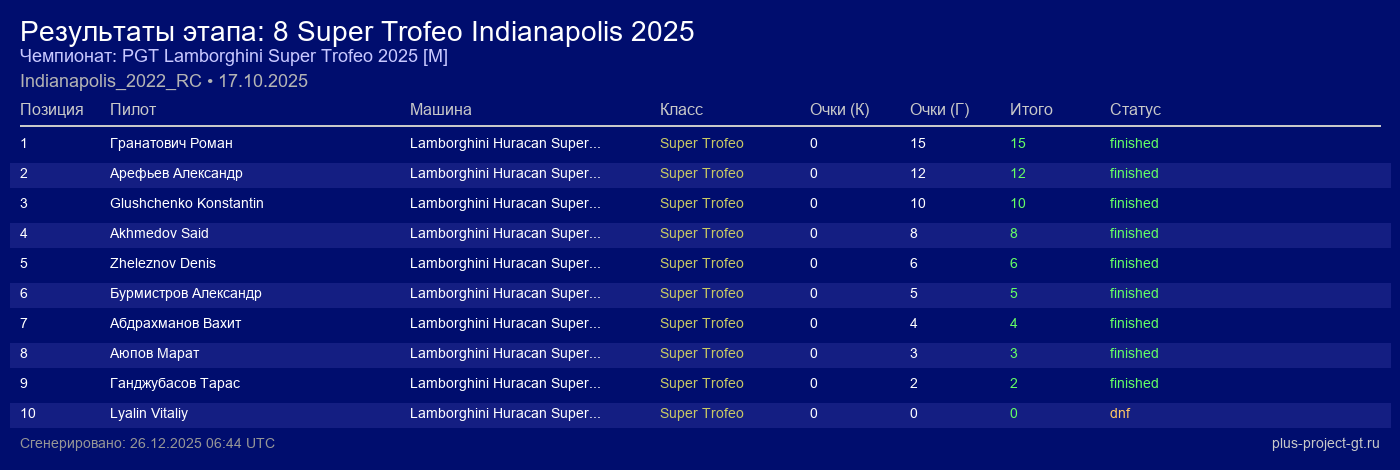 Lamborghini Huracan Super Trofeo EVO2 | 6 | 32 | 1:25.290 | 46:25.510 | Финиш | |