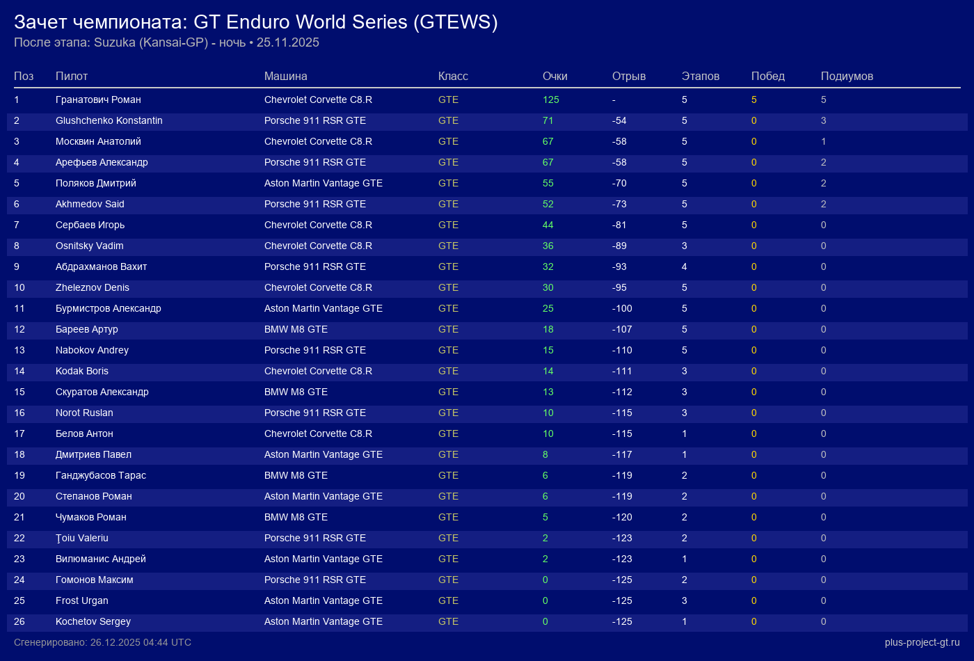 Aston Martin Vantage GTE | WSI Thunder Garage | 3 | 43 | 1:59.151 | 91:05.500 | Финиш |