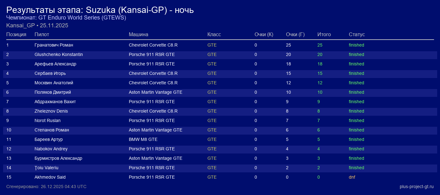 Aston Martin Vantage GTE | WSI Thunder Garage | 10 | 45 | 1:58.721 | 92:16.010 | Финиш |