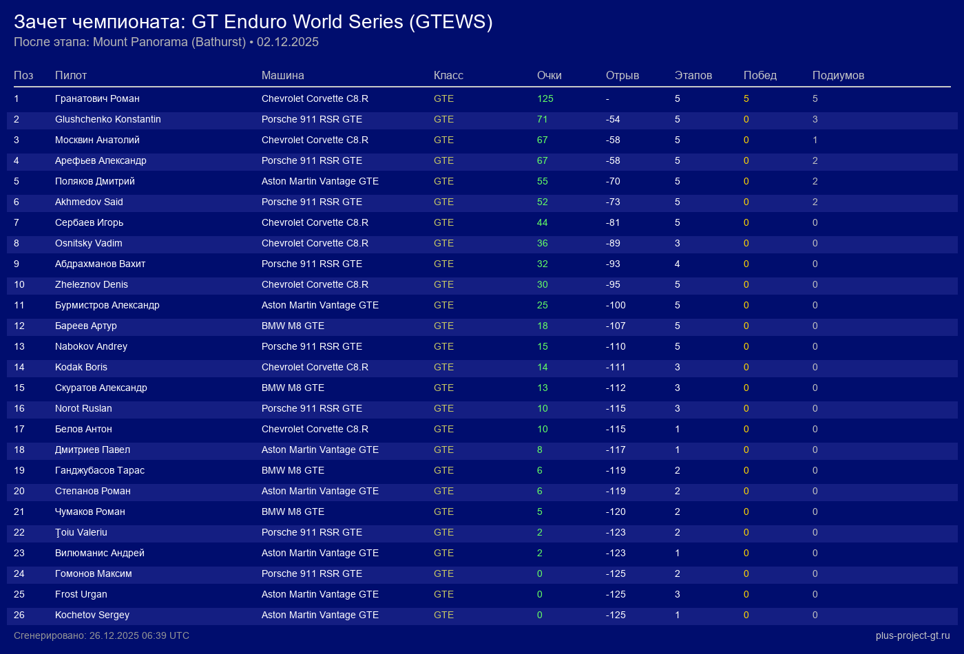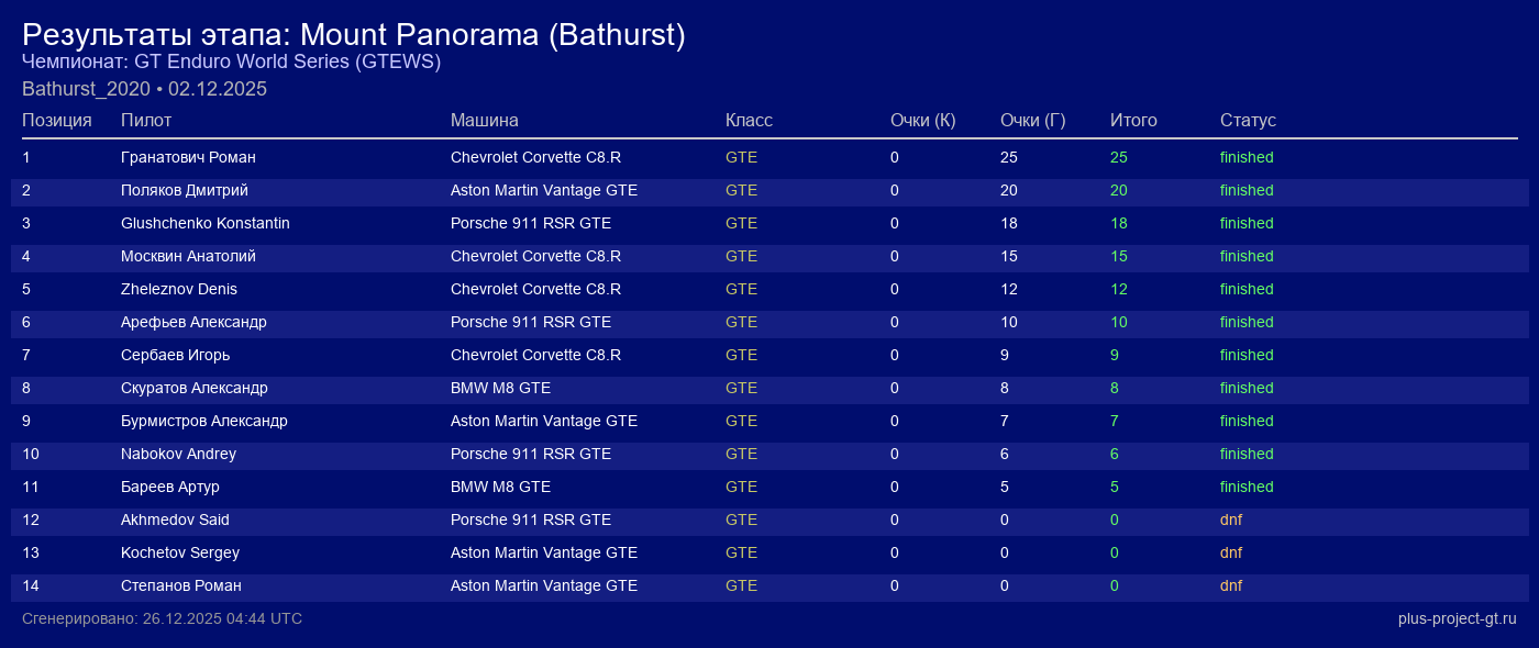 Aston Martin Vantage GTE | WSI Thunder Garage | 20 | 44 | 2:02.116 | 91:04.910 | Финиш |