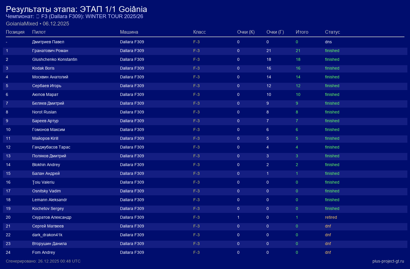 Dallara F309 | Slippery racing | 0 | 16 | 1:20.573 | 26:51.670 | Финиш |