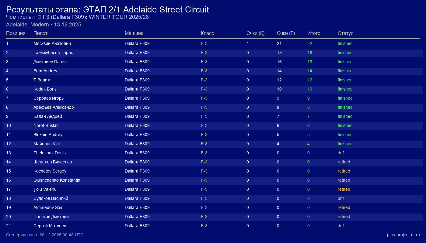 Dallara F309 | Диванные гонсчеги | 4 | 12 | 1:25.838 | 26:08.310 | Финиш |