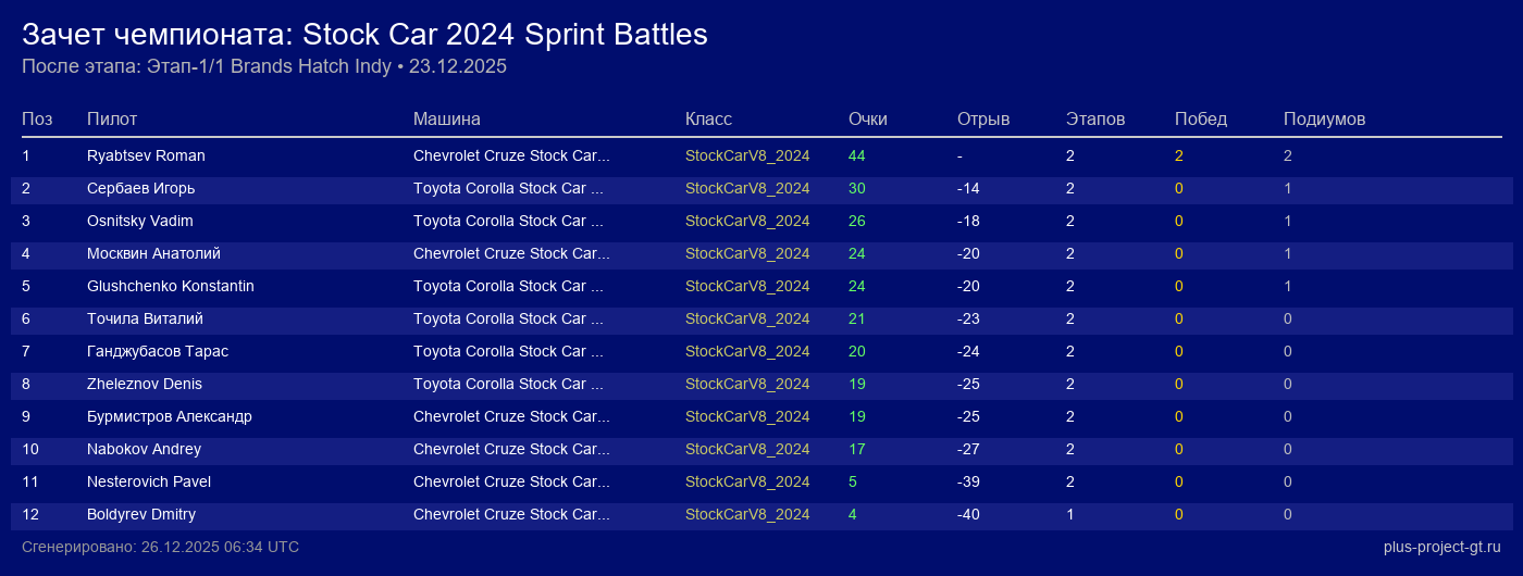 Toyota Corolla Stock Car 2024 | 10 | 23 | 0:49.870 | 20:42.720 | Финиш | |