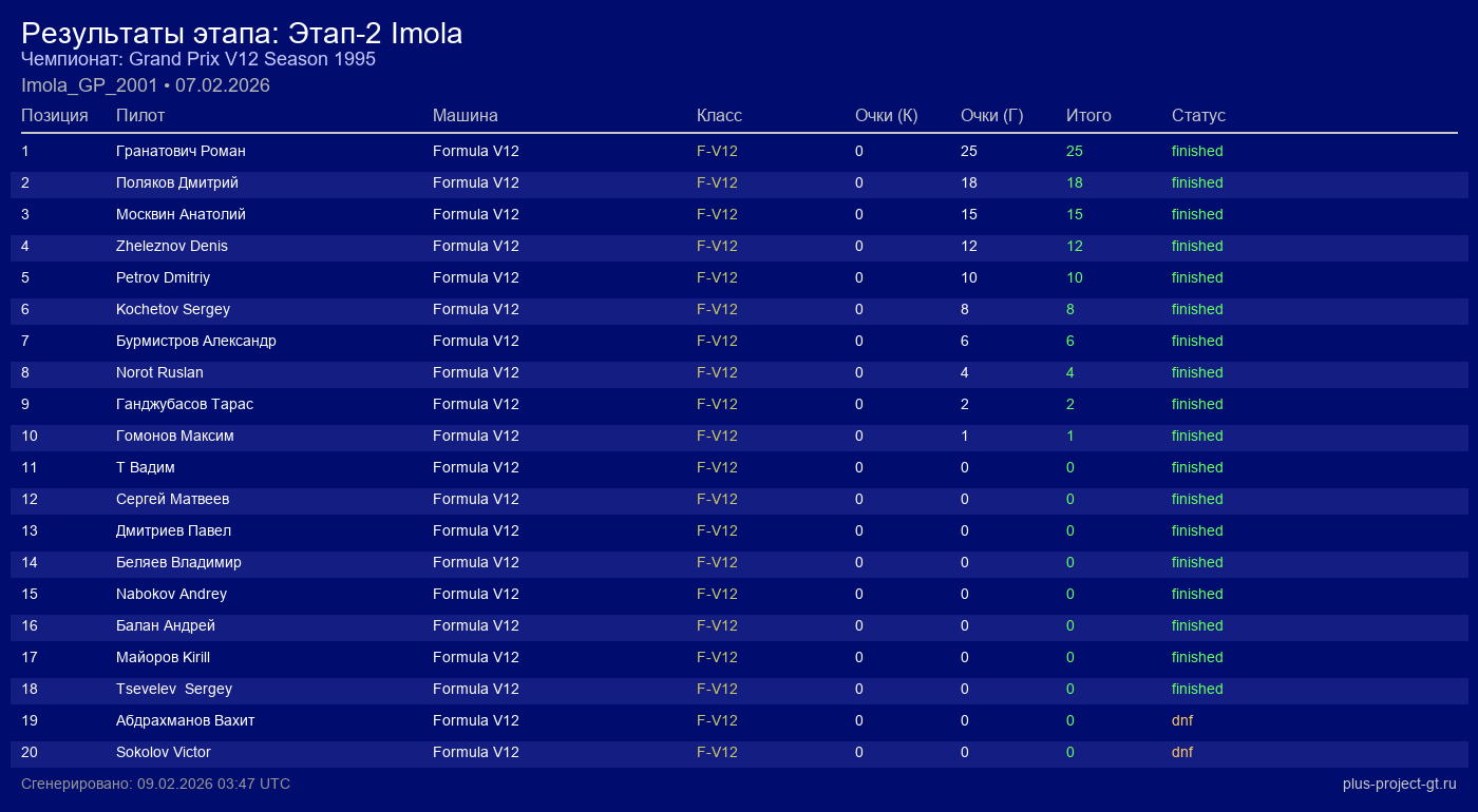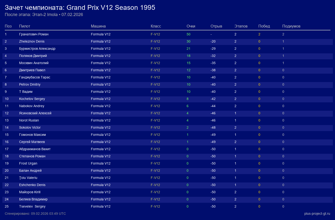 Formula V12 | Диванные гонсчеги | 0 | 37 | 1:35.259 | 65:06.080 | Финиш |