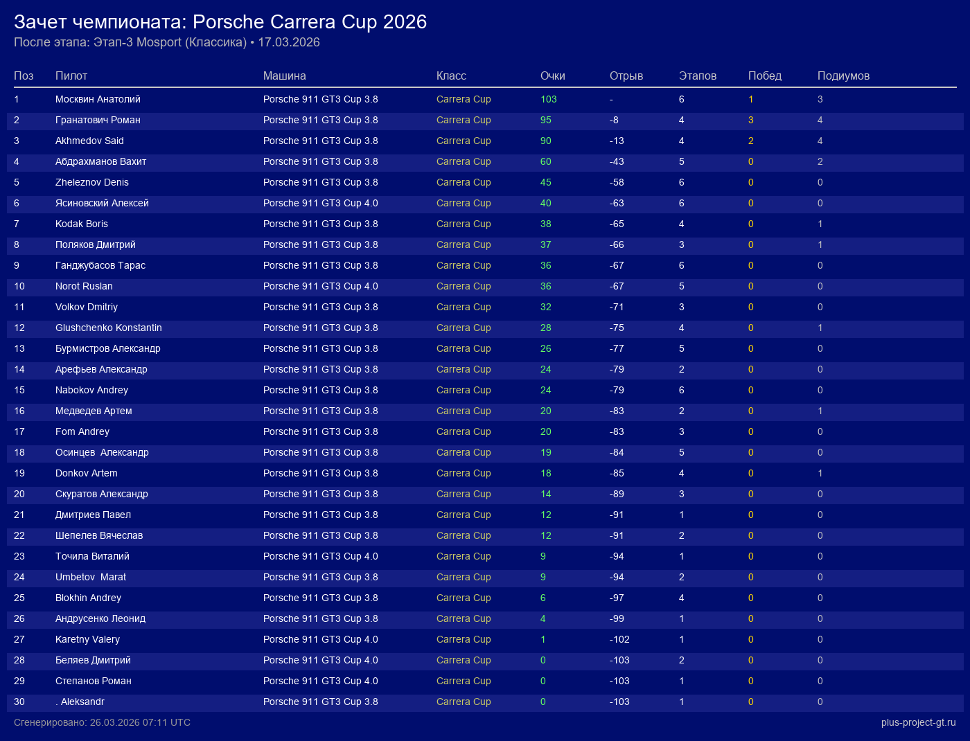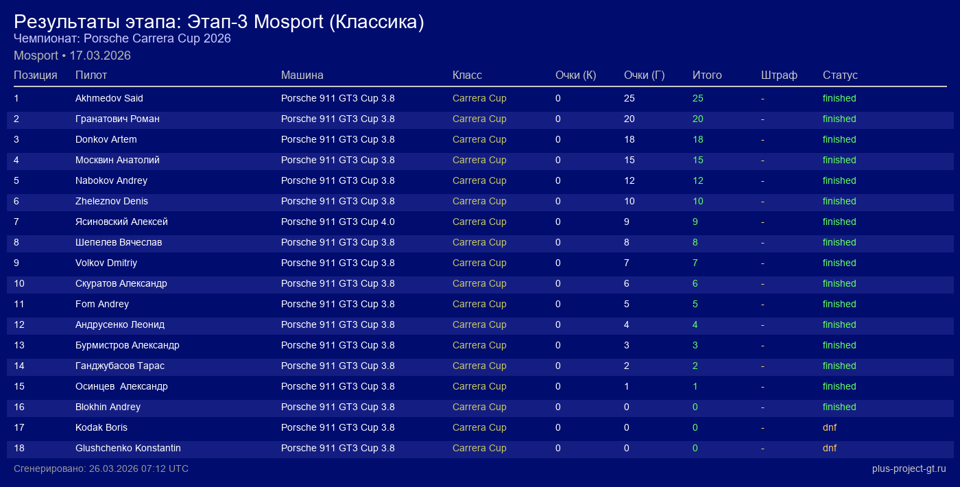 Porsche 911 GT3 Cup 3.8 | 3 | 29 | 1:22.090 | 42:21.850 | — | Финиш | |