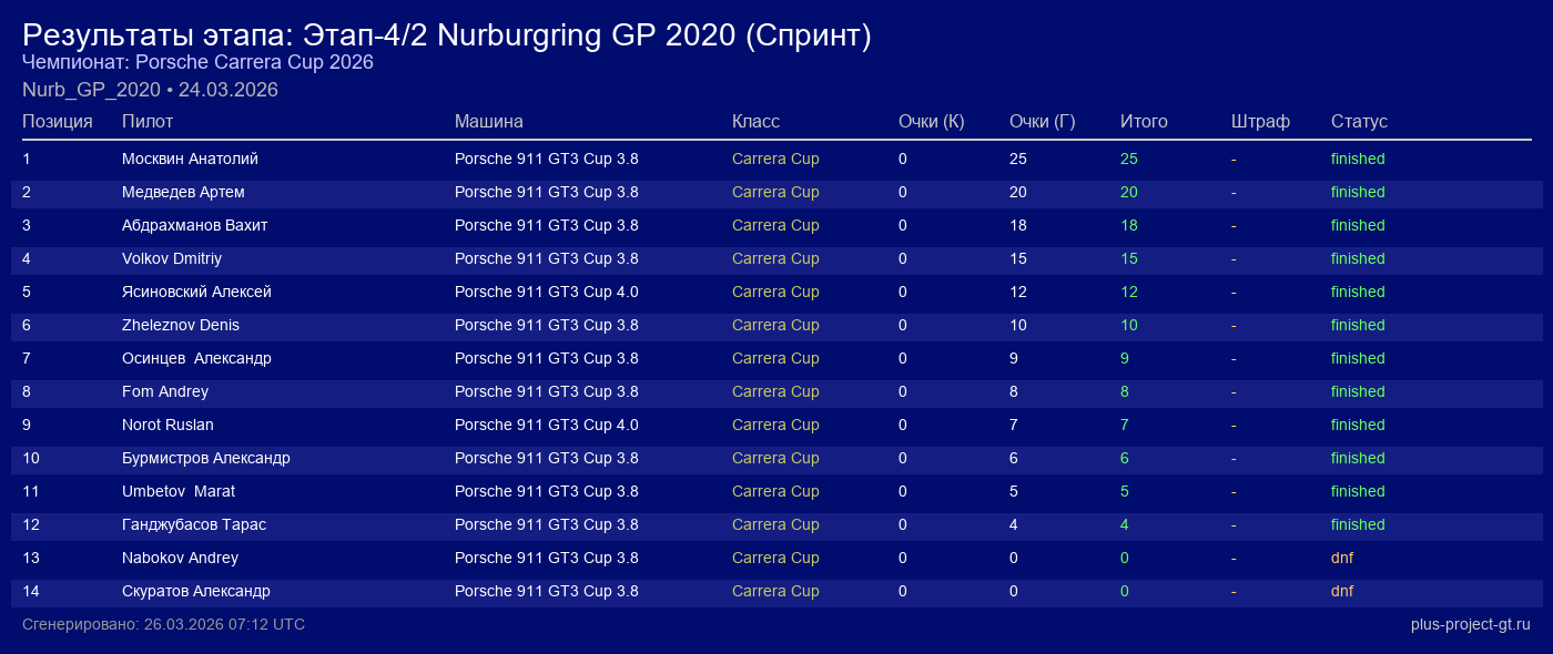 Porsche 911 GT3 Cup 4.0 | 12 | 12 | 2:02.594 | 25:51.770 | — | Финиш | |