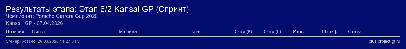 | Поз. | Δ | Пилот | Машина | Команда | Очки | Круги | Быстрый круг | Полное время | Штраф | Статус |