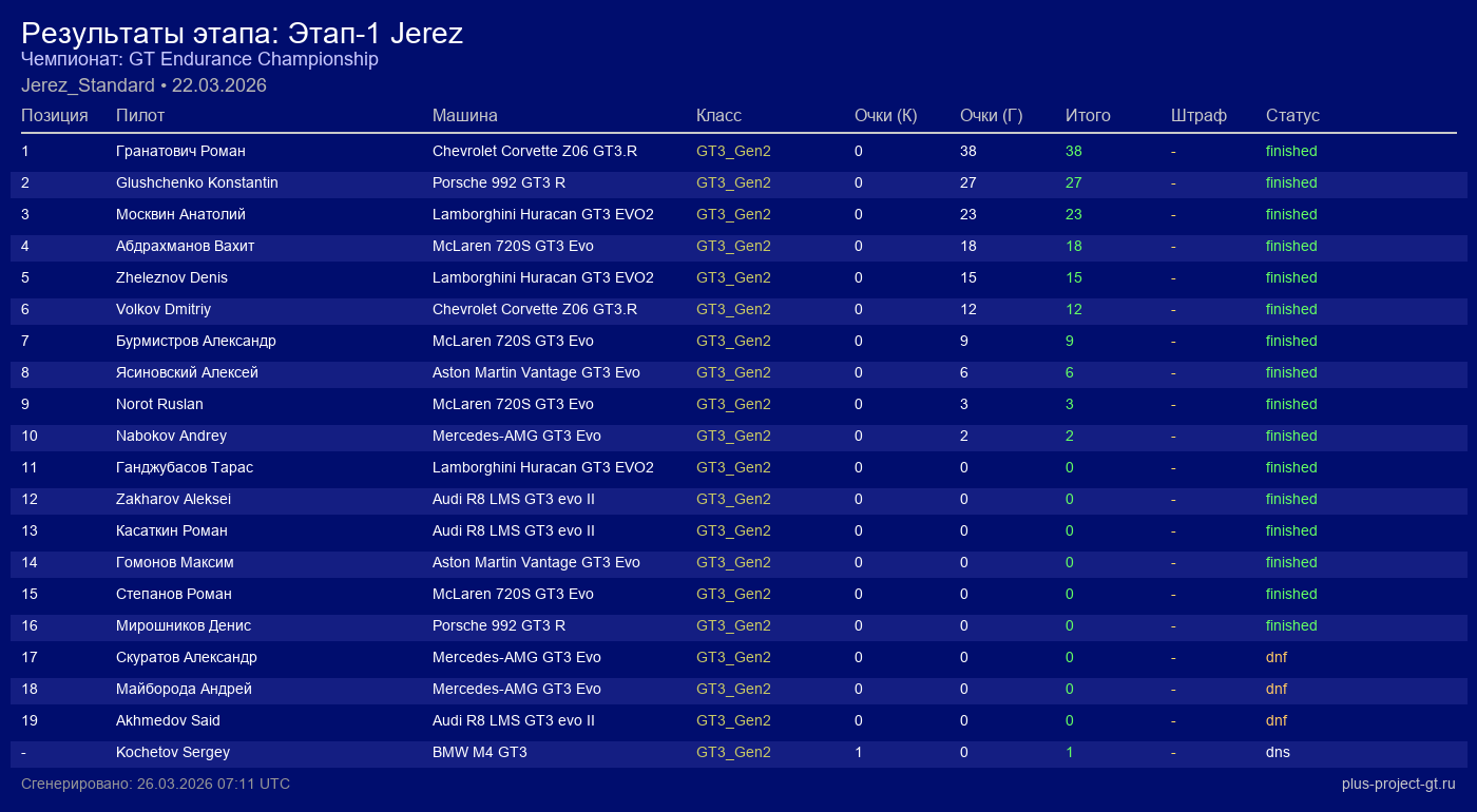 McLaren 720S GT3 Evo | 0 | 53 | 1:39.340 | 96:16.420 | — | Финиш | |