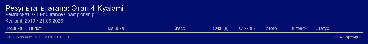 Поз. Δ Пилот Машина Команда Очки Круги Быстрый круг Полное время Штраф Статус