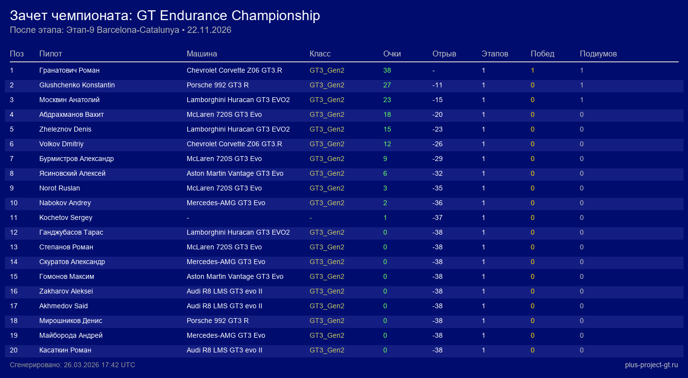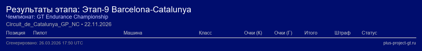 | Поз. | Δ | Пилот | Машина | Команда | Очки | Круги | Быстрый круг | Полное время | Штраф | Статус |