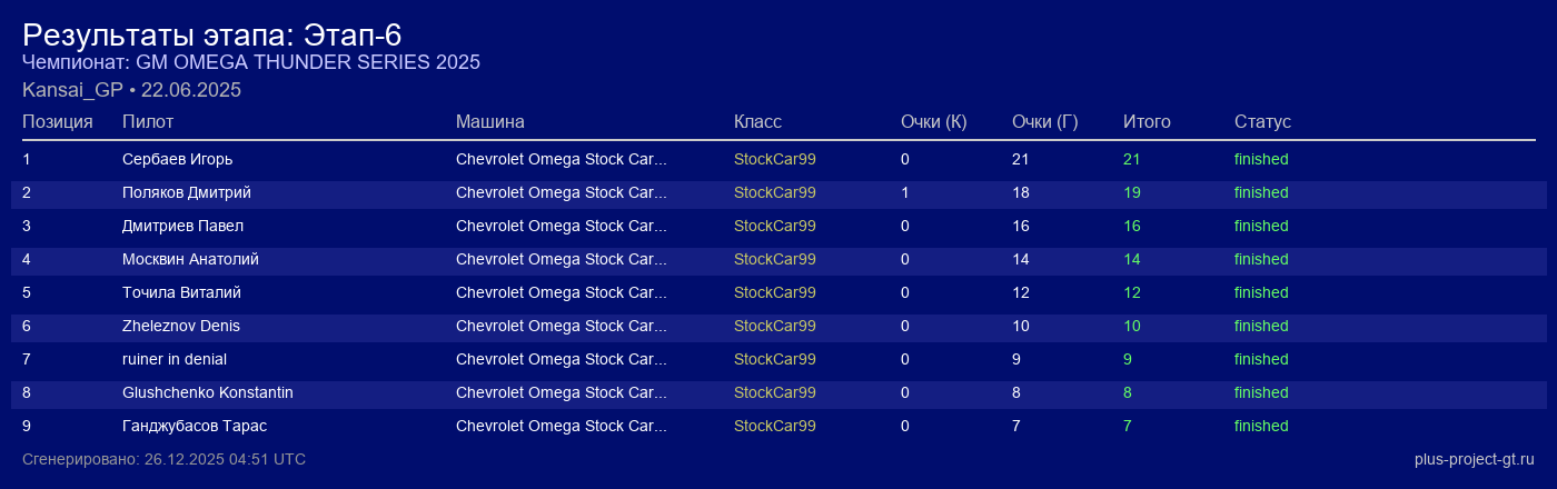 Chevrolet Omega Stock Car 1999 | WSI Thunder Garage | 16 | 18 | 2:18.566 | 42:03.830 | Финиш |