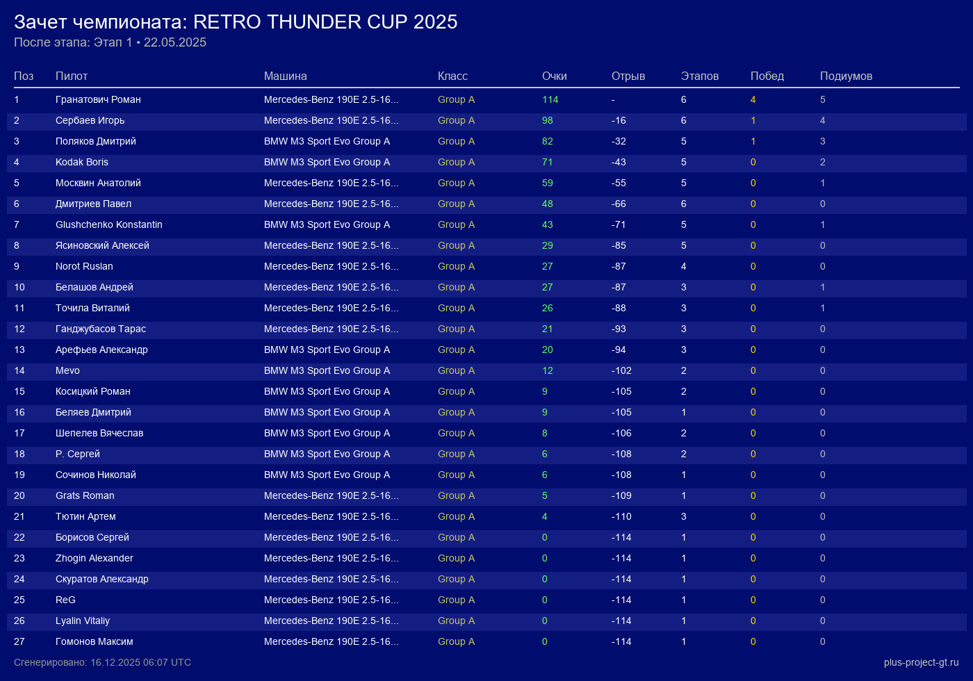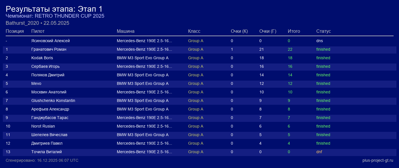 BMW M3 Sport Evo Group A | WSI Thunder Garage | 14 | 18 | 2:17.909 | 41:52.600 | Финиш |