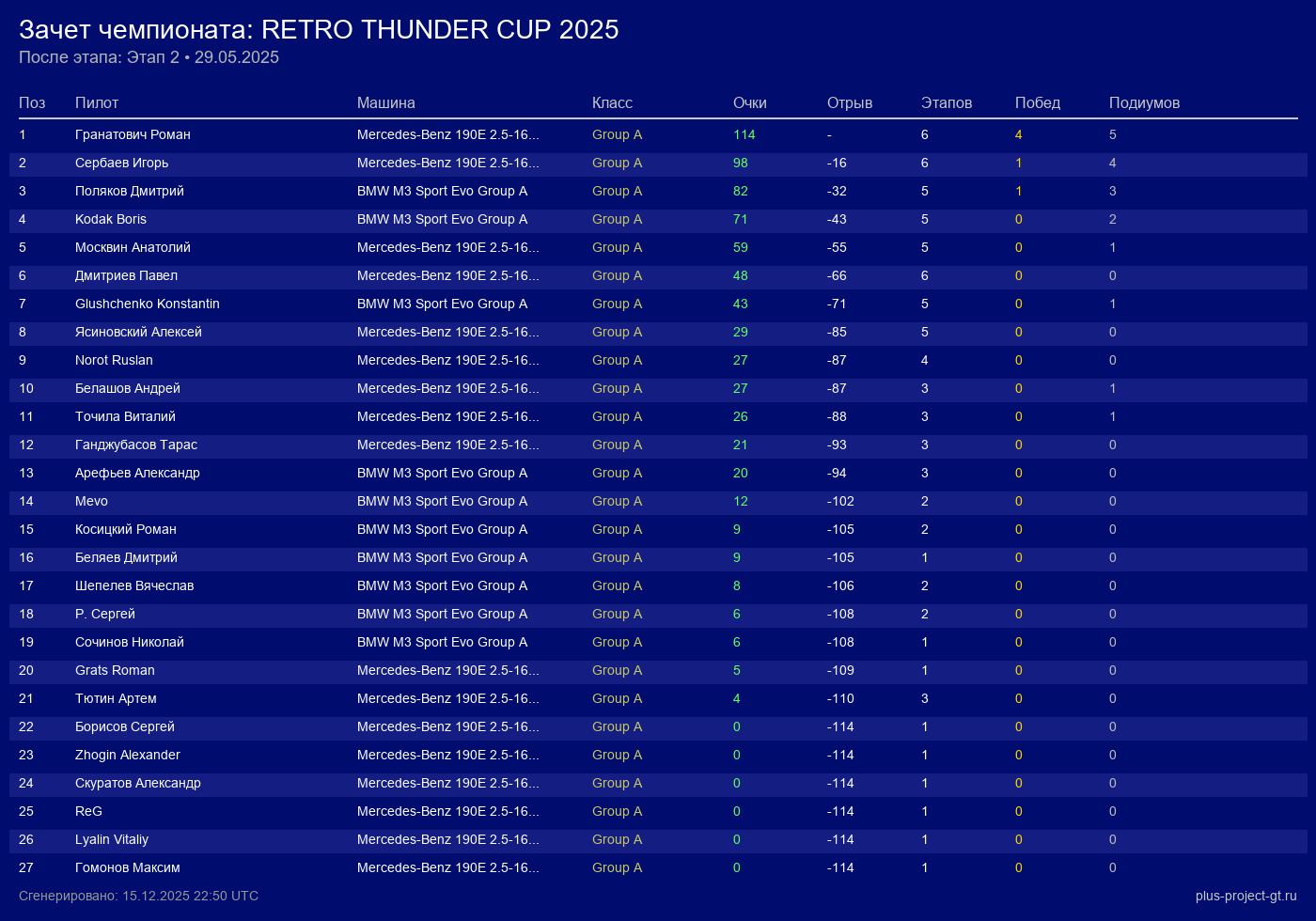 BMW M3 Sport Evo Group A | WSI Thunder Garage | 14 | 21 | 1:56.952 | 41:39.020 | Финиш |