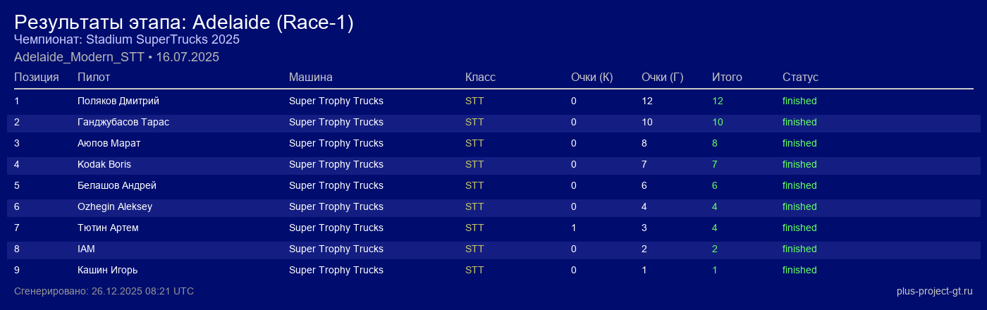 Super Trophy Trucks | 4 | 9 | 1:41.227 | 16:58.650 | Финиш | |