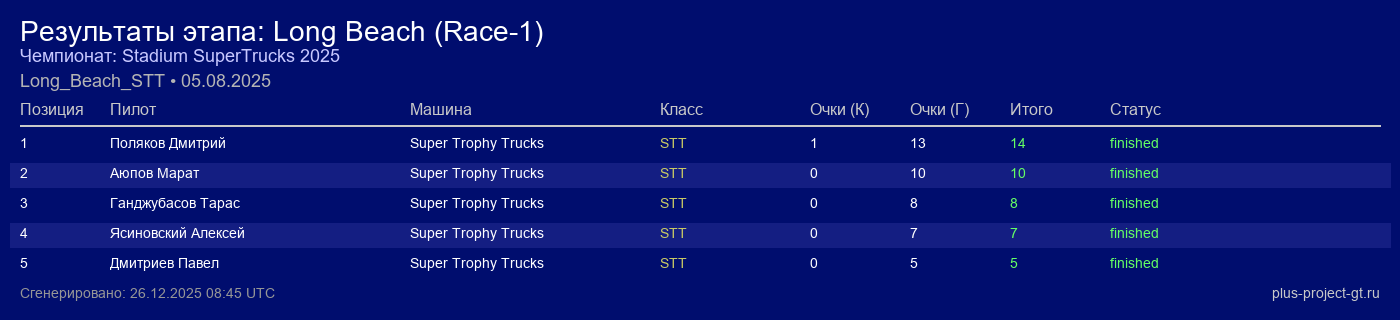 Super Trophy Trucks | 8 | 9 | 1:45.470 | 16:29.410 | Финиш | |