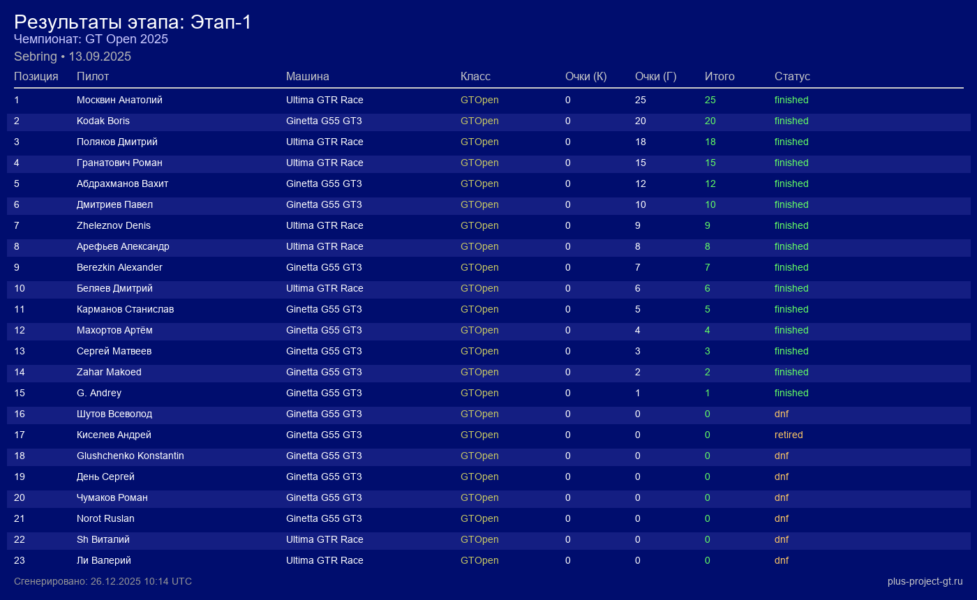 Ultima GTR Race | WSI Thunder Garage | 18 | 36 | 2:02.476 | 76:44.010 | Финиш |