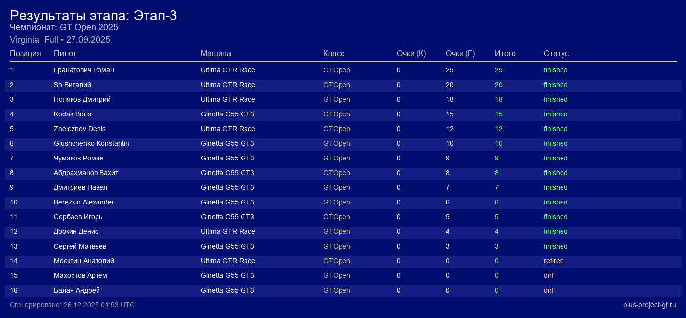 Ginetta G55 GT3 | Racing Games Community | 9 | 43 | 1:46.272 | 78:32.320 | Финиш |