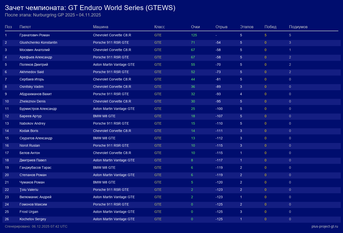 Aston Martin Vantage GTE | VR StreetRacers | 8 | 46 | 1:57.636 | 91:59.550 | Финиш |