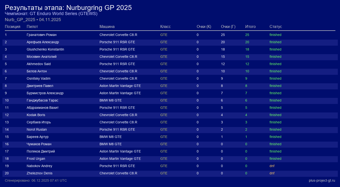 Aston Martin Vantage GTE | WSI Thunder Garage | 7 | 46 | 1:56.796 | 92:12.290 | Финиш |