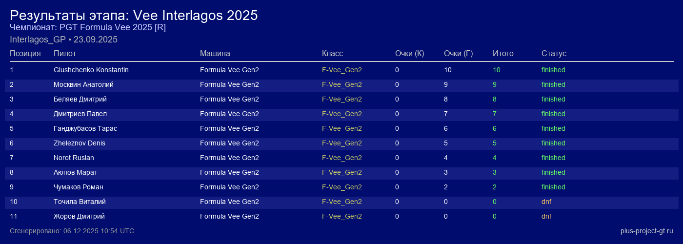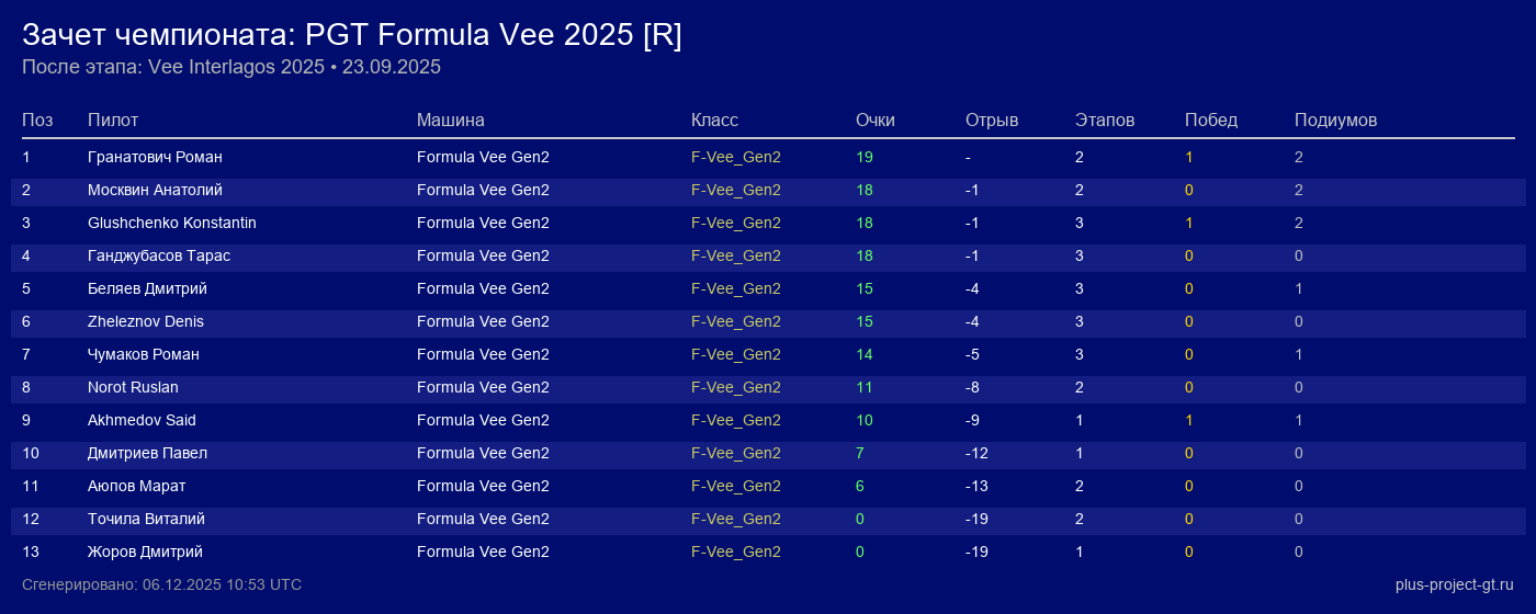 Formula Vee Gen2 | 8 | 13 | 2:03.389 | 27:00.640 | Финиш | |