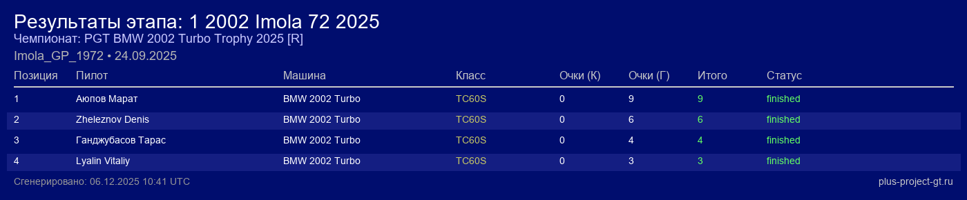 BMW 2002 Turbo | 4 | 5 | 2:01.254 | 10:25.609 | Финиш | |