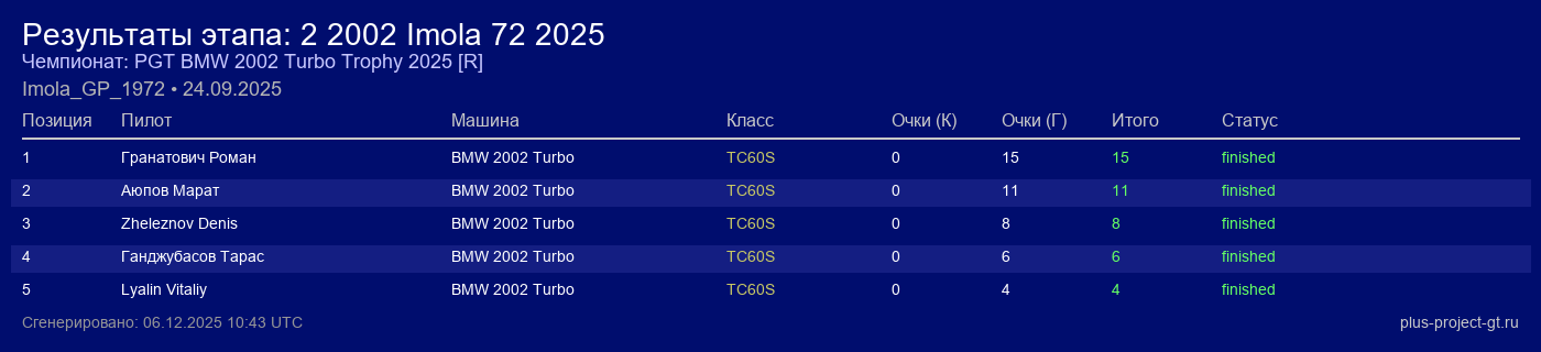 BMW 2002 Turbo | 6 | 10 | 2:01.224 | 21:09.070 | Финиш | |