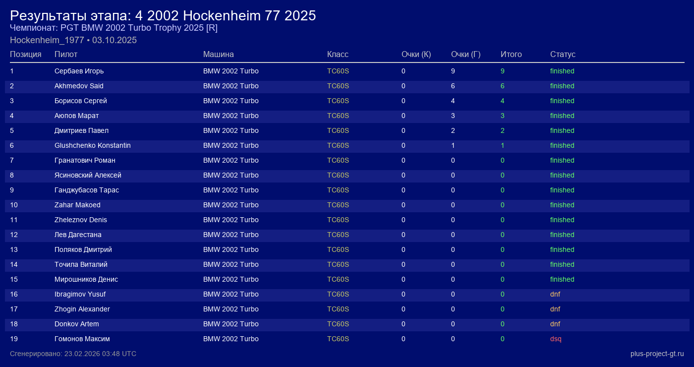 BMW 2002 Turbo | 0 | 4 | 2:37.635 | 10:58.002 | Финиш | |