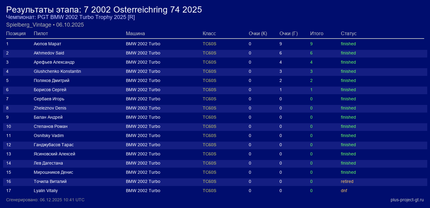 BMW 2002 Turbo | 0 | 5 | 2:16.126 | 11:48.598 | Финиш | |