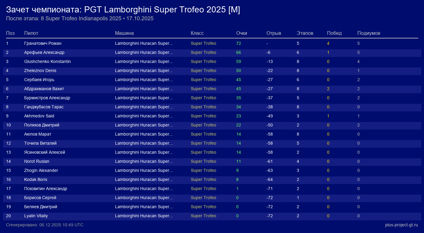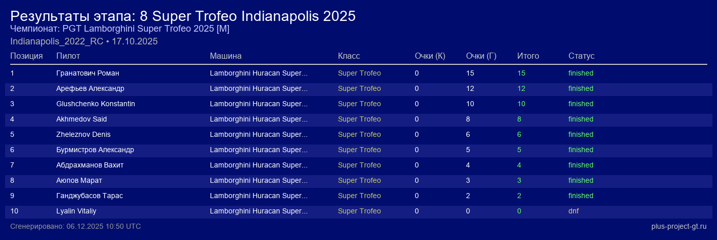 Lamborghini Huracan Super Trofeo EVO2 | 6 | 32 | 1:25.290 | 46:25.510 | Финиш | |