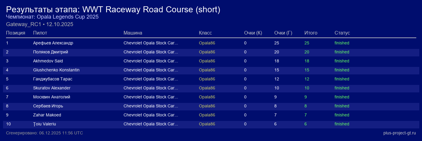 Skuratov Alexander | Chevrolet Opala Stock Cars 1986 | 10 | 27 | 1:06.970 | 30:50.090 | Финиш | |