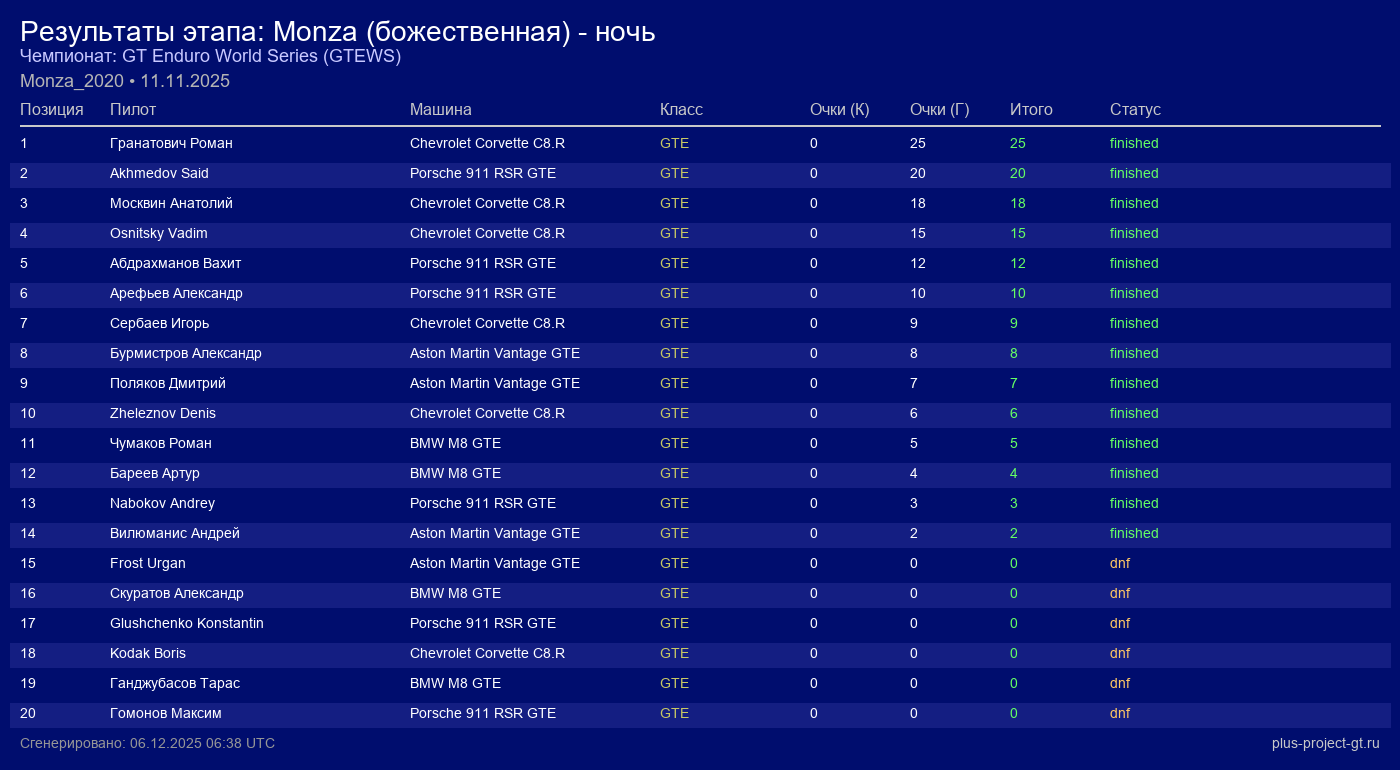 BMW M8 GTE | Racing Games Community | 5 | 49 | 1:46.631 | 91:59.670 | Финиш |