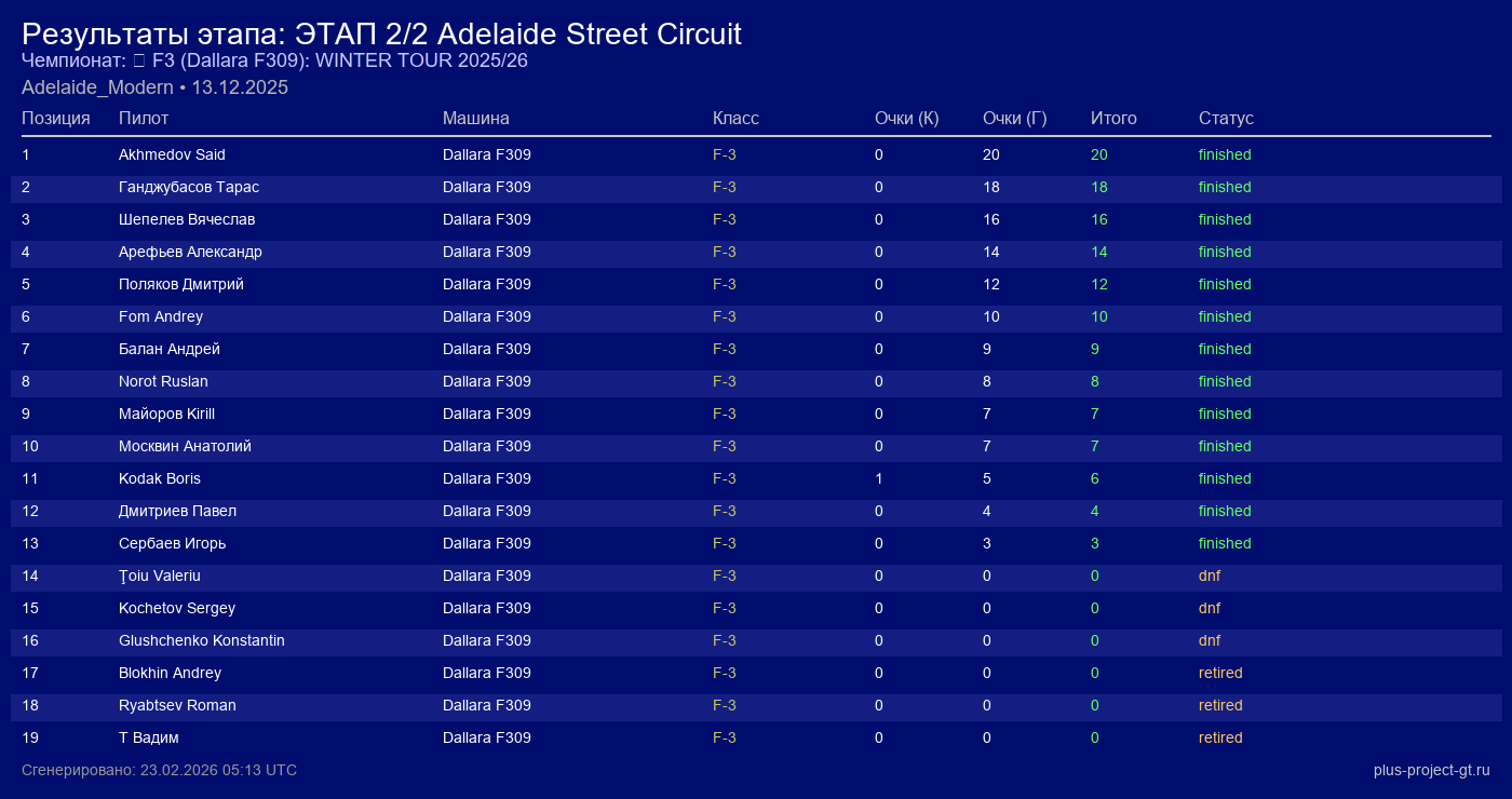 Dallara F309 | Force Feedback | 7 | 18 | 1:17.753 | 26:57.180 | Финиш |