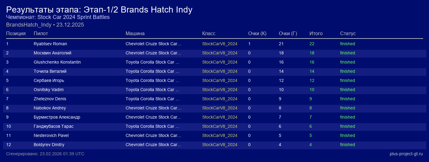 Toyota Corolla Stock Car 2024 | 12 | 25 | 0:48.574 | 21:08.300 | Финиш | |