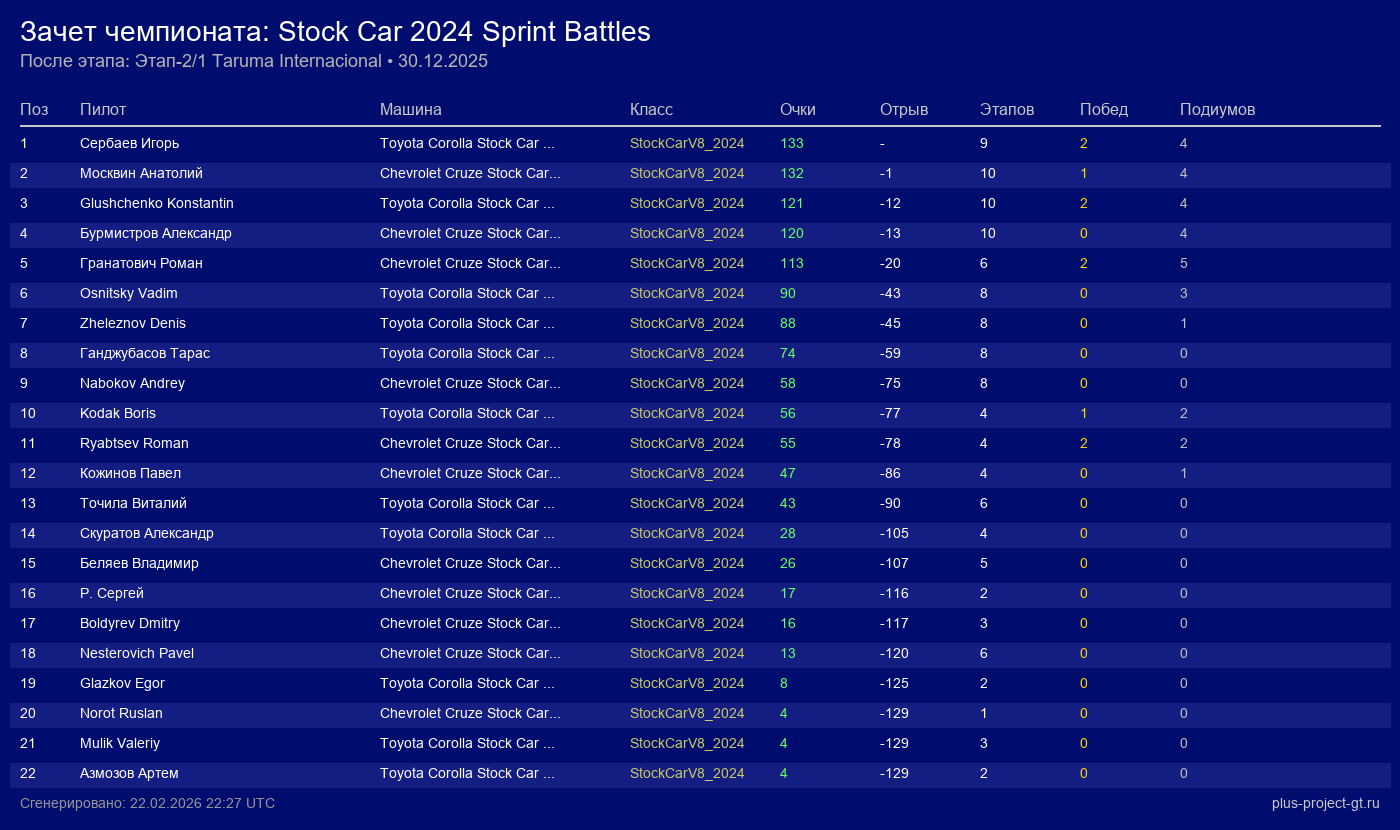 Toyota Corolla Stock Car 2024 | 10 | 18 | 1:07.568 | 21:45.520 | Финиш | |