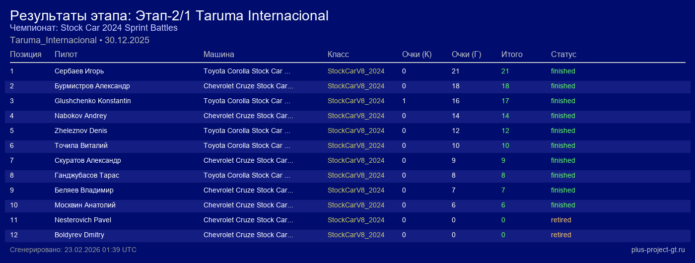 Toyota Corolla Stock Car 2024 | 12 | 18 | 1:07.410 | 21:39.220 | Финиш | |