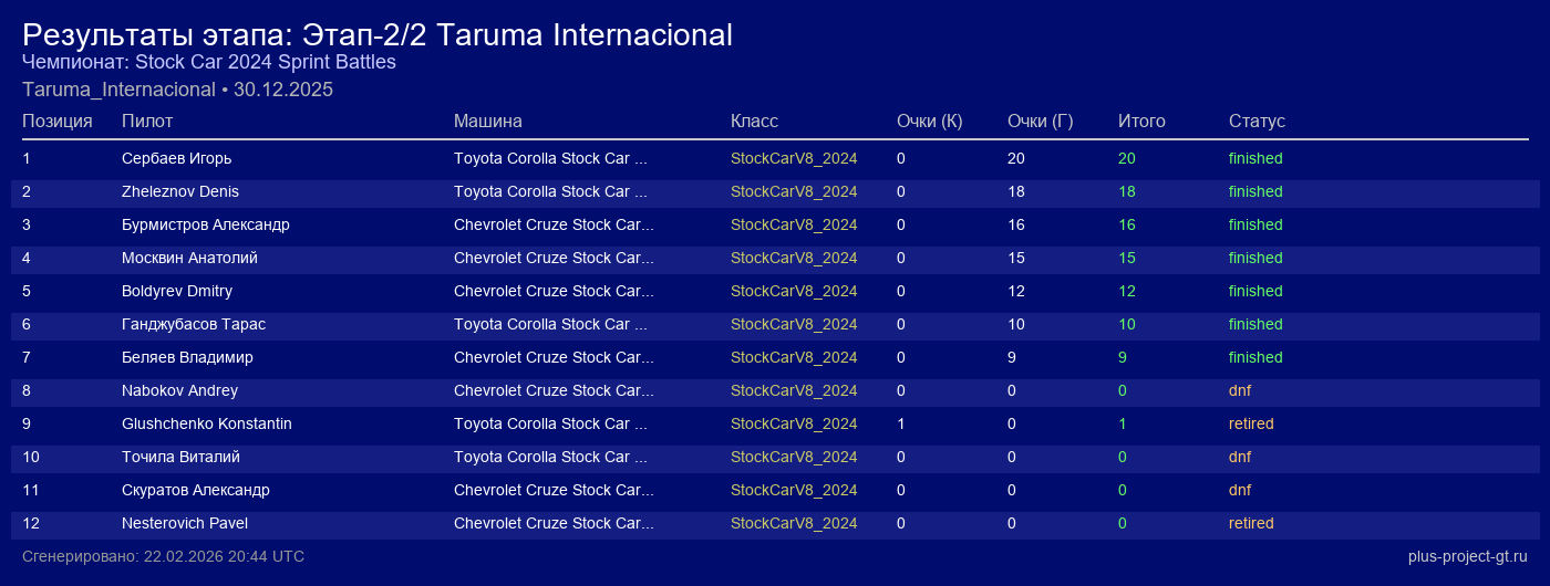 Toyota Corolla Stock Car 2024 | 18 | 17 | 1:07.823 | 20:50.430 | Финиш | |