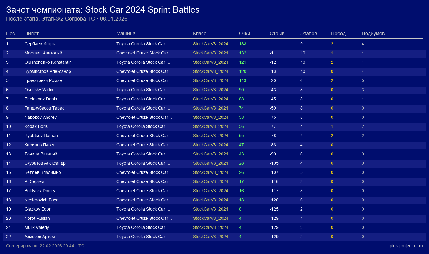 Chevrolet Cruze Stock Car 2024 | 18 | 16 | 1:15.646 | 21:00.510 | Финиш | |