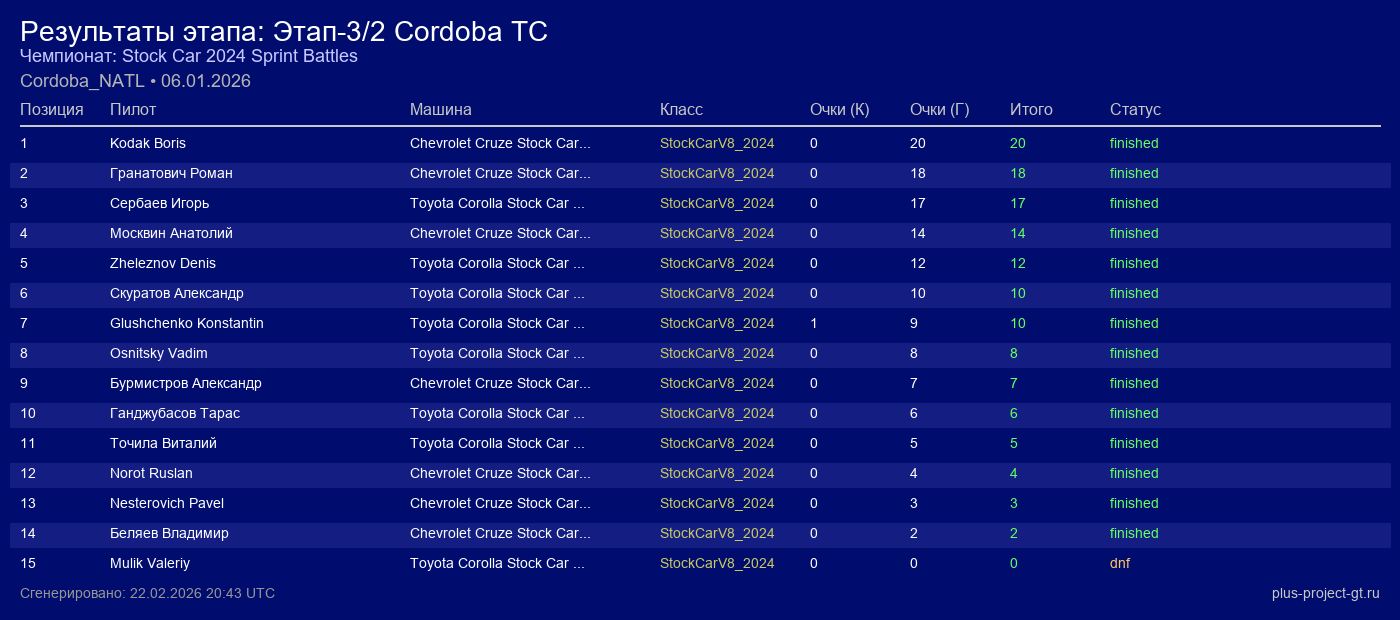 Chevrolet Cruze Stock Car 2024 | 7 | 16 | 1:16.240 | 21:37.490 | Финиш | |