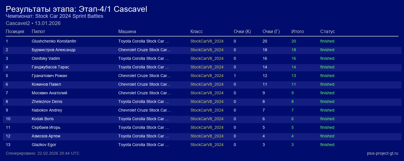 Toyota Corolla Stock Car 2024 | 4 | 15 | 1:09.826 | 20:31.310 | Финиш | |