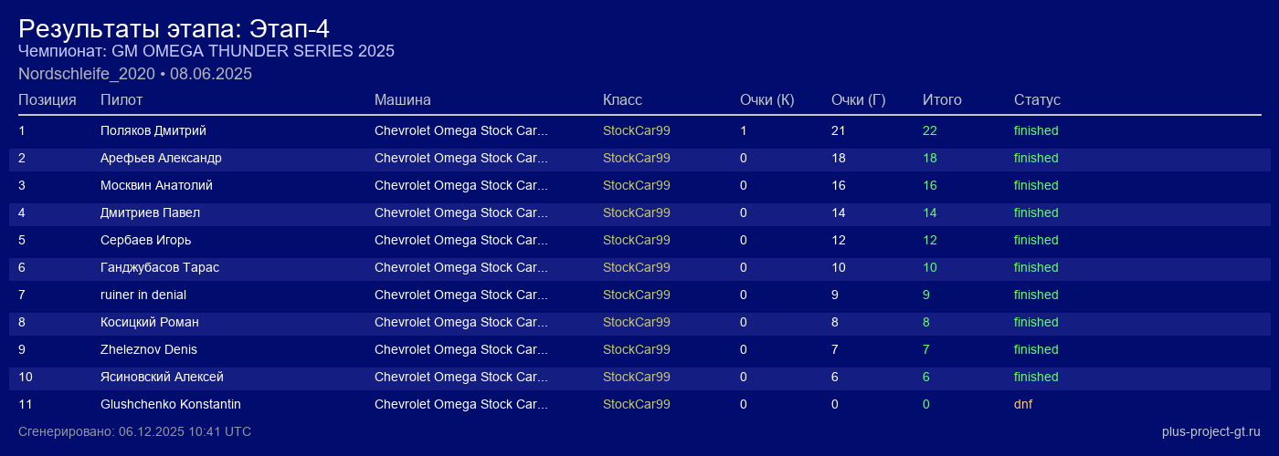 Chevrolet Omega Stock Car 1999 | WSI Thunder Garage | 14 | 6 | 7:39.782 | 46:18.940 | Финиш |