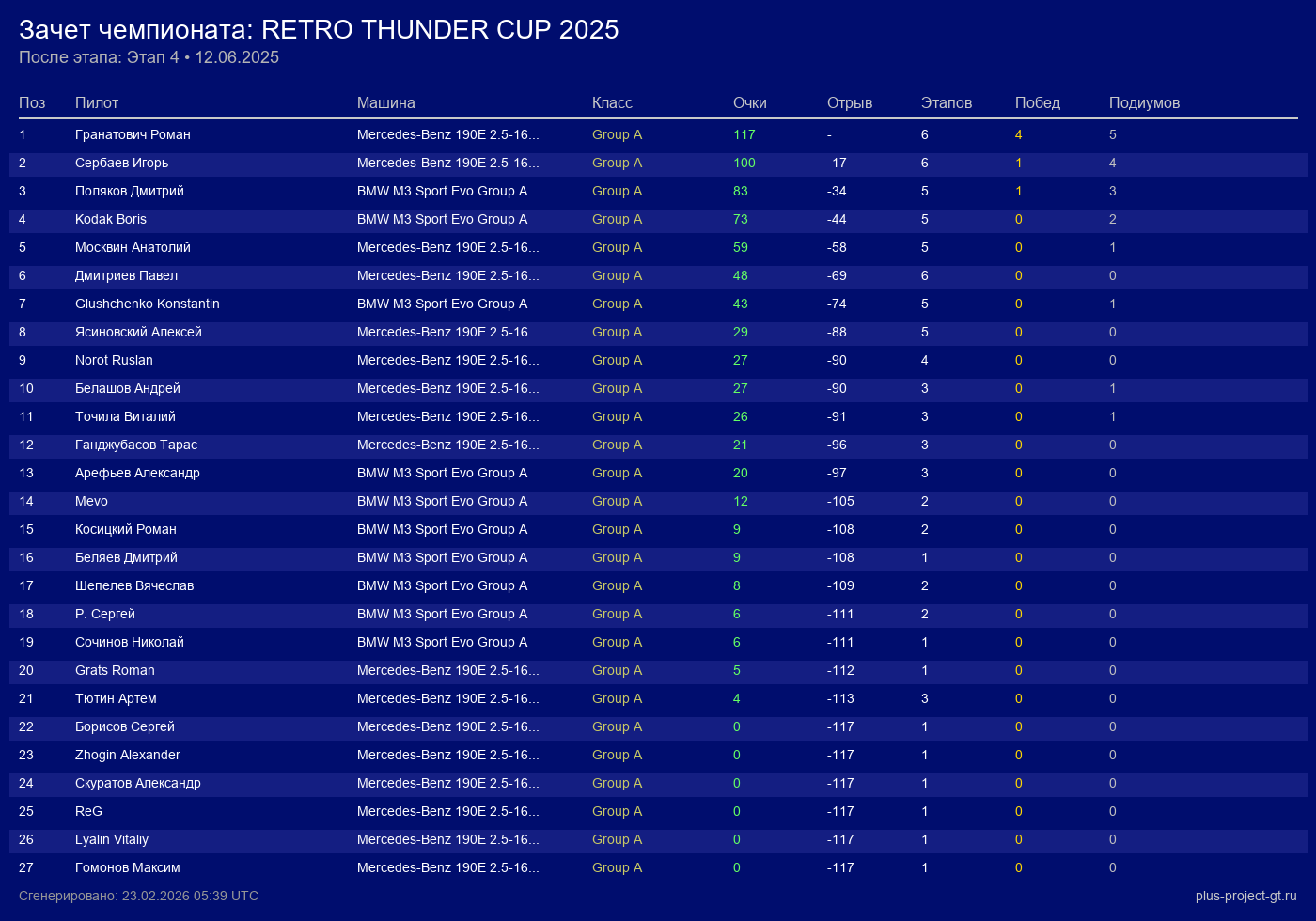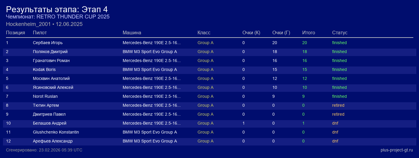 BMW M3 Sport Evo Group A | WSI Thunder Garage | 18 | 17 | 2:21.138 | 40:43.670 | Финиш |